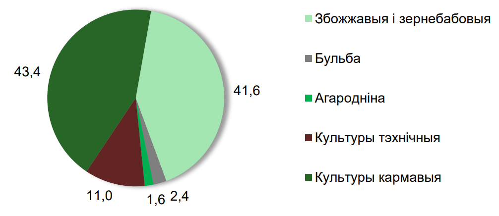 Агульная пасяўная плошча сельскагаспадарчых культур у 2025 годзе ў гаспадарках усіх катэгорый (у сельскагаспадарчых арганізацыях, сялянскіх (фермерскіх) гаспадарках, гаспадарках насельніцтва) склала 5785,8 тыс. гектараў. На долю сельскагаспадарчых арганізацый прыходзілася 92,5% ад агульнай пасяўной плошчы, сялянскіх (фермерскіх) гаспадарак – 3,6%, гаспадарак насельніцтва – 3,9%.