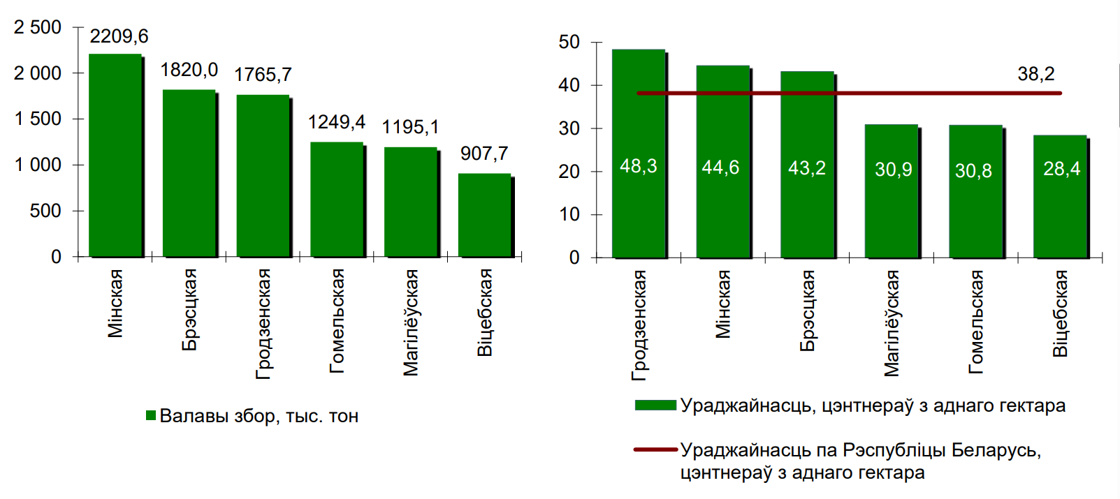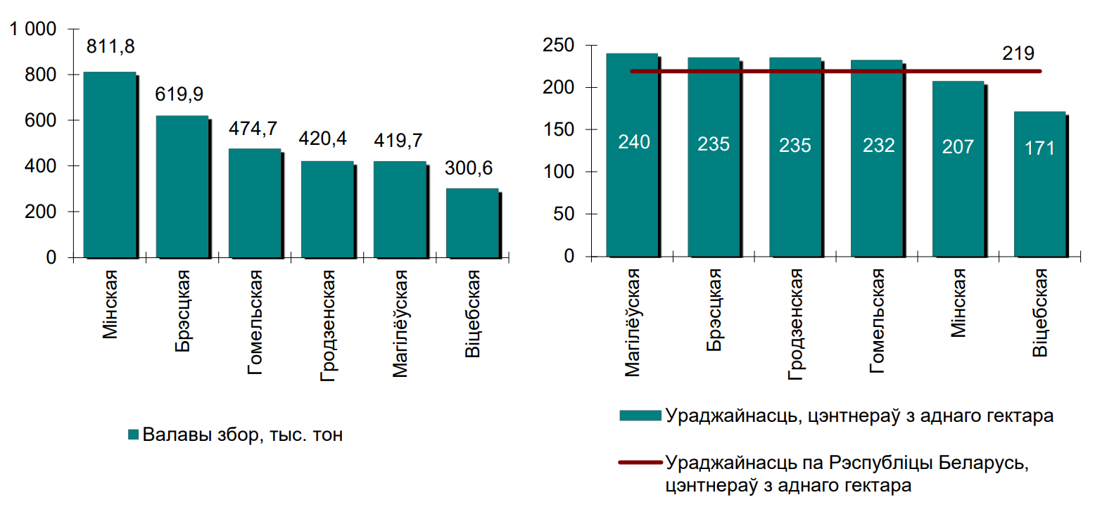 У 2025 годзе ў гаспадарках усіх катэгорый намалочана збожжа (у вазе пасля дапрацоўкі) 9,1 млн. тон пры сярэдняй ураджайнасці 38,2 цэнтнера з аднаго гектара. Па аб’ёмах вытворчасці збожжа першынство належыць Мінскай вобласці (2,2 млн. тон, або 24,2% ад агульнага аб’ёма вытворчасці ў рэспубліцы).