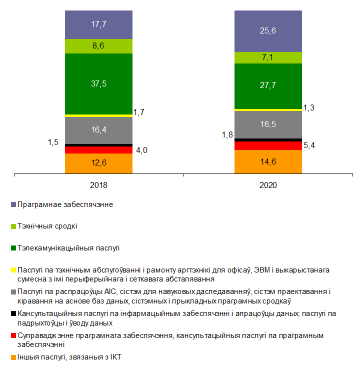 Структура адгружанай прадукцыі (работ, паслуг) арганізацый сектара ІКТ