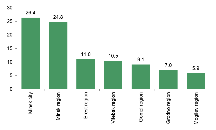 Shares of regions and Minsk city in commodity exports of the Republic of Belarus in 2025