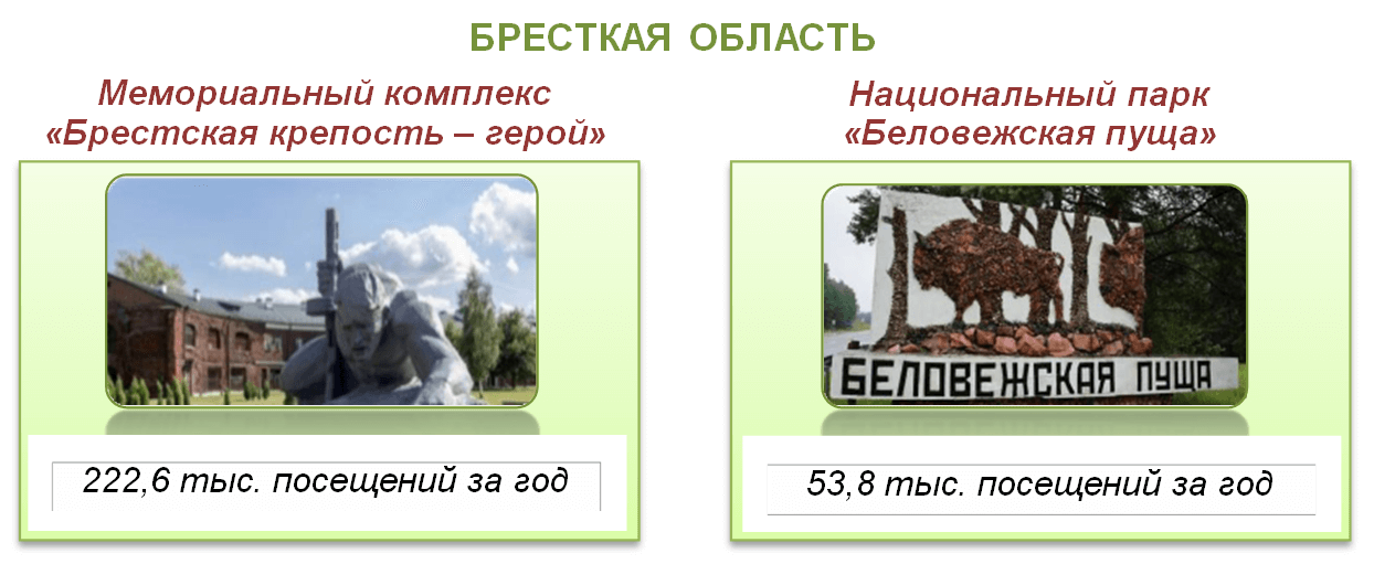 Национальный парк «Беловежская пуща», замковый комплекс «Мир», а также архитектурно-культурный комплекс резиденции Радзивиллов в Несвиже включены в список всемирного культурного и природного наследия ЮНЕСКО.